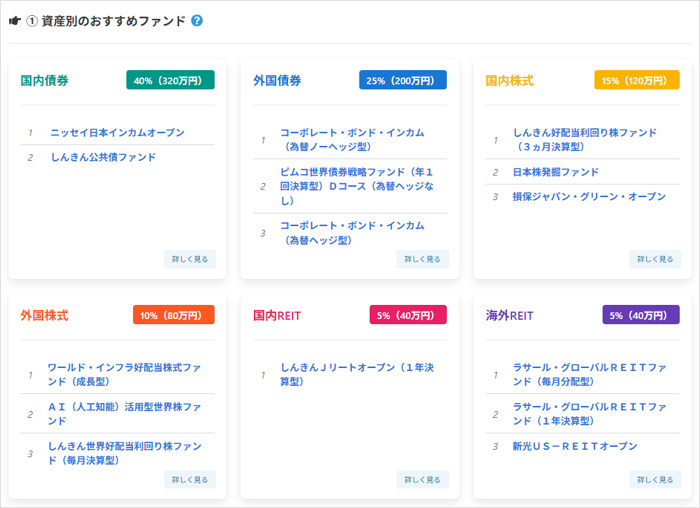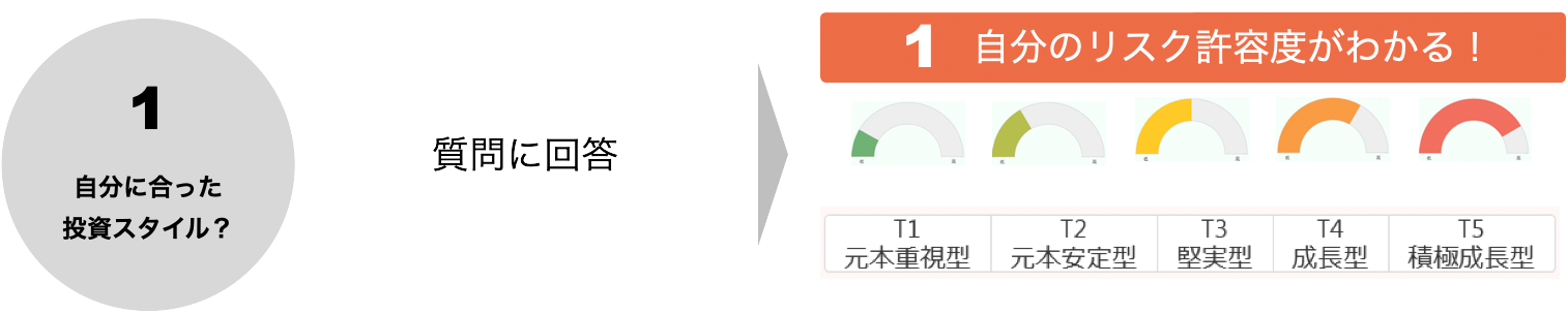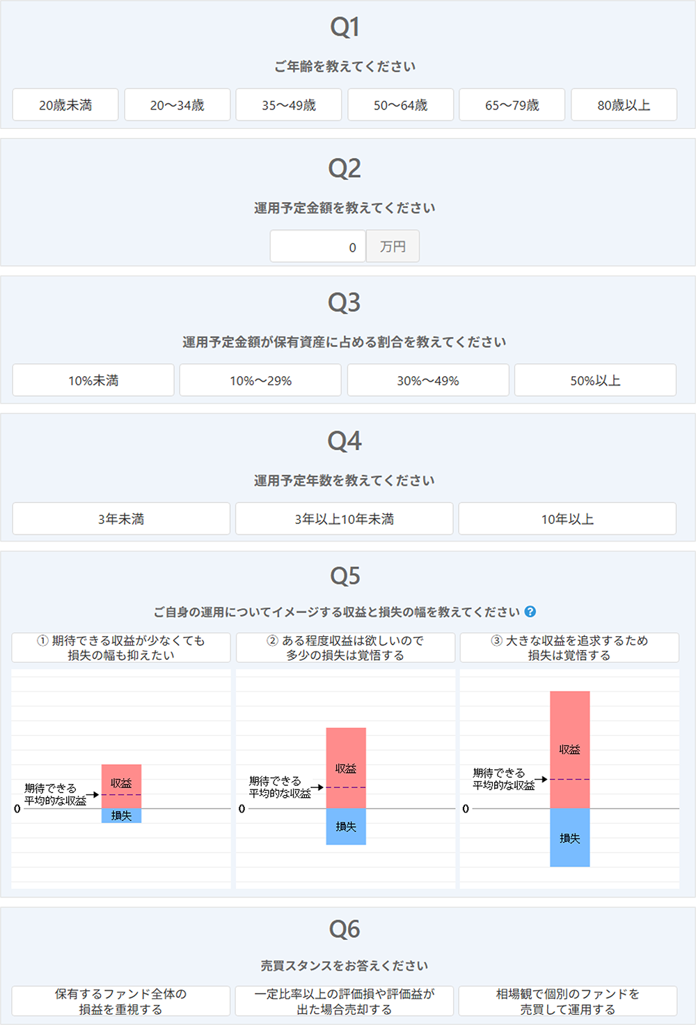 あらかじめ設定された質問に回答すると、投資のリスクに対して保守的か積極的か等、自分に合った投資スタイルが表示されます。