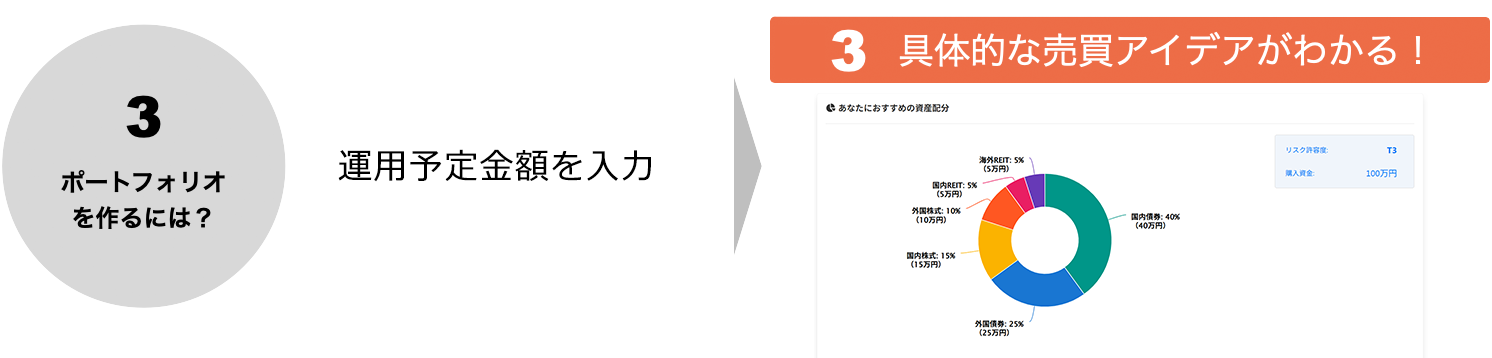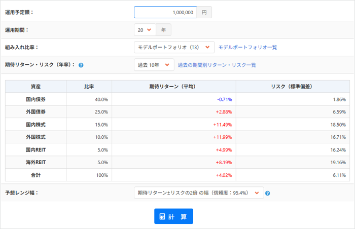 運用予定金額を入力すると、リスク許容度に応じた最適なモデルポートフォリオを提示します。