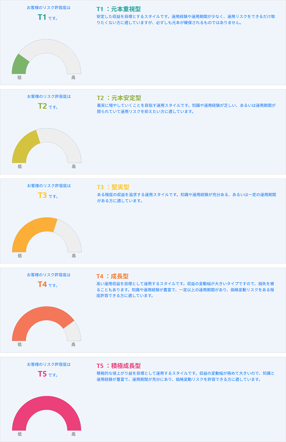 年齢・運用予定年数・売買スタンス等、あらかじめ設定された質問に回答すると、リスク許容度を5段階で提示します。