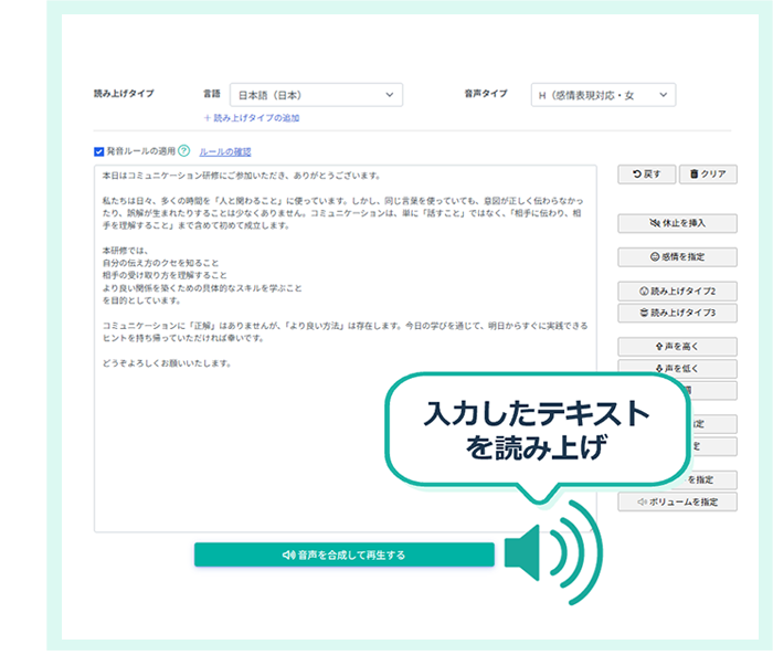 - 読み上げタイプ(音声)や感情、声の高さ、スピード等を指定できます。
