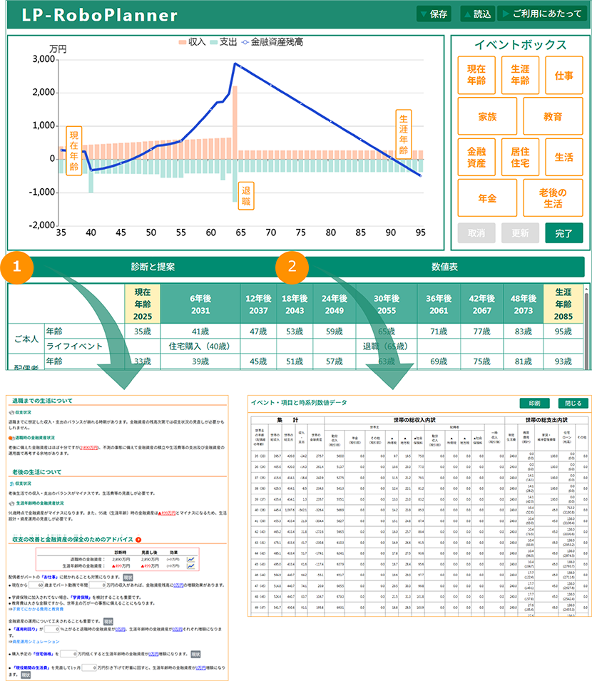 ① 「診断と提案」をクリックすると、退職時の金融資産状況と生涯にわたる収支状況についての分析と診断が表示されます。
