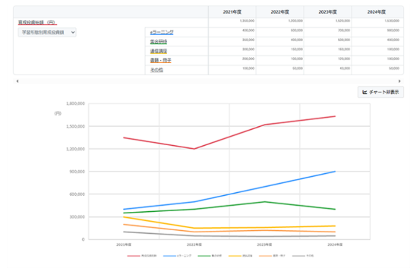 - 多様な形態(企業購入、人件費、機会費用、個人申込補助金、自主受講等)の育成投資の自動集計額と人的資本の対比分析(EITAM)