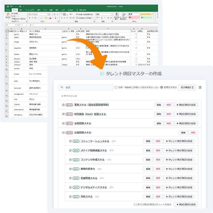 TASVITでは、マスターリスト(あるいは皆さま独自のスキル項目・測定項目)から選択した項目について、最上位のスキル項目から下位各層の項目、測定項目までの全容と各階層のレーダーチャートを目視しながら、容易に貼り付けたり、変更したりすることで、簡単にスキルマップを作成できます。