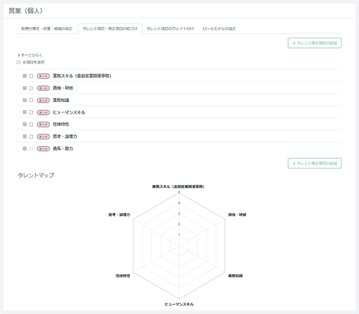 属性区分ごとのスキル項目・測定項目の設定とそれらのレベルを測定・可視化したスキルマップの作成